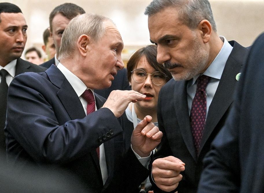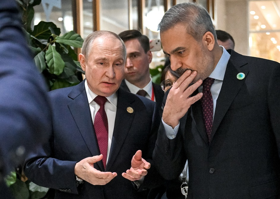 وبعد انتهاء لقائه مع أردوغان وشريف، تبادل بوتين أطراف الحديث مع وزير الخارجية التركي فيدان، الذي رافق الرئيس الروسي حتى موكبه تقريبا.