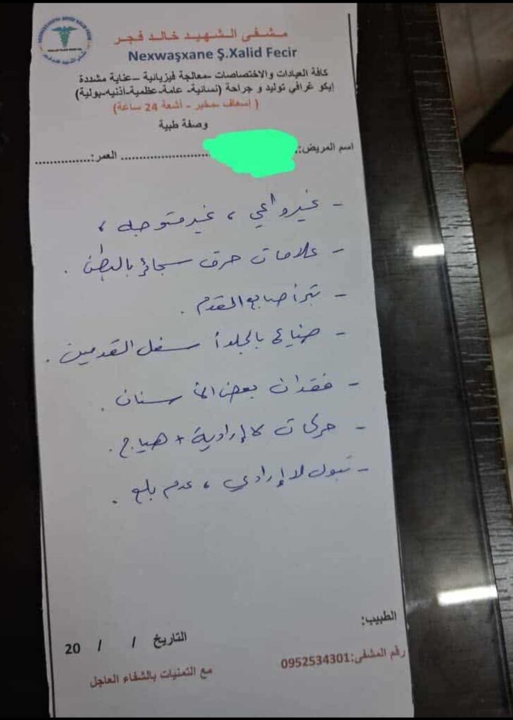 وأشار إلى، أن رغم تلقيه العلاج في مدينة حلب، إلا أن وضعه الصحي يزداد سوءاً، إذ يعاني من هزال شديد وعجز عن الحركة، فيما وصف الأطباء حال الأعصاب في قدميه بأنها “ميتة” نتيجة الضرر الدائم.