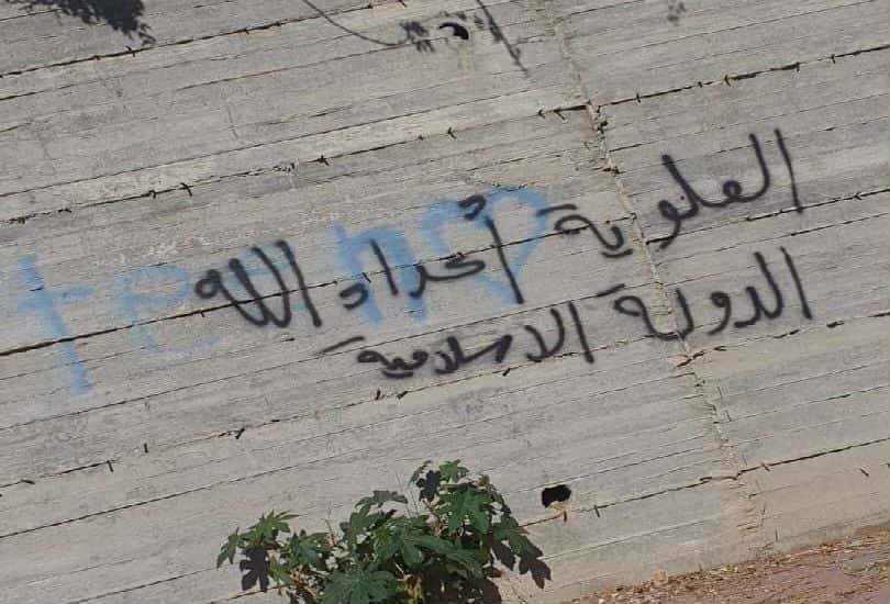 وصباح اليوم الجمعة، كتب على أحد الجدران في منطقة متحلق جبلة بالقرب من حي الفيض، الذي تسكنه أغلبية سنية، عبارات مثل “الطائفة العلوية أعداء الله”.. “الدولة الإسلامية”.