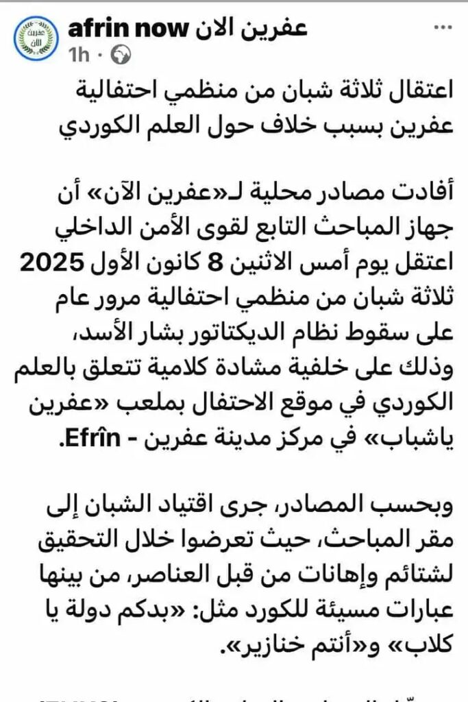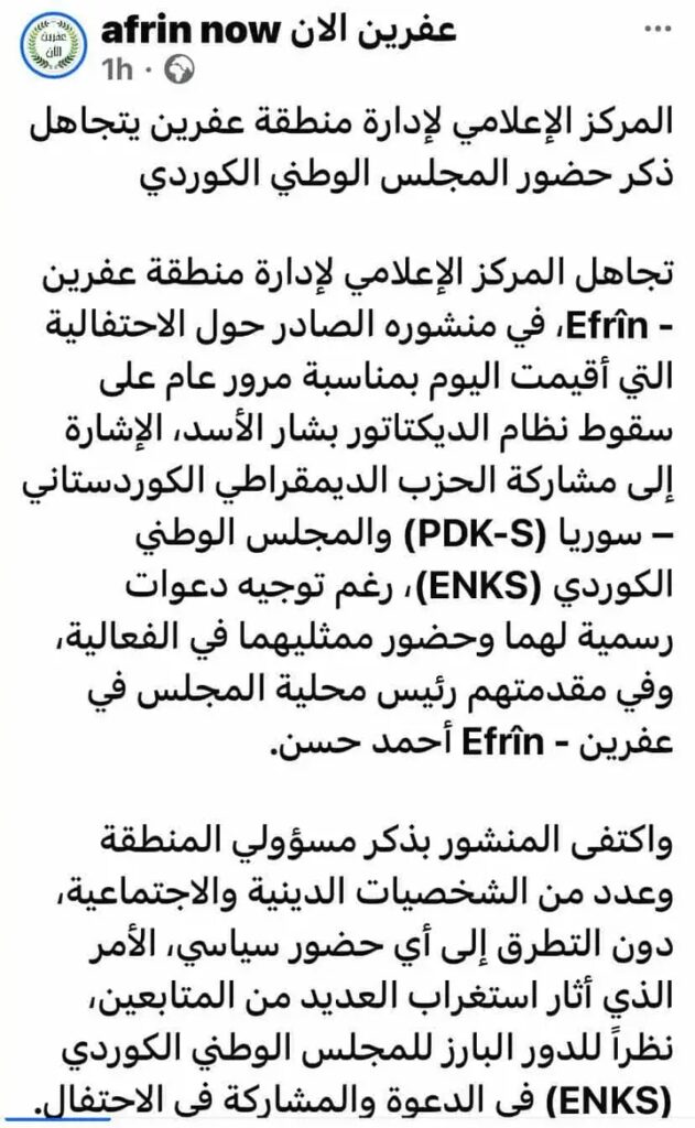 وربما كان هذا الأمر مقبولًا أو مبرَّرًا لو أنكم اجتمعتم أمام مكتبكم في عفرين، ورفعتم راياتكم وأعلامكم الخاصة، وعقدتم حلقات الدبكة هناك، مع إصدار بيان بخصوص المناسبة، والإشادة بفرحة السوريين — كردًا وعربًا — بفرار الطاغية، مع مطالبة سلطات دمشق بتبييض سجون عفرين من المعتقلين أسوةً ببقية السجون في سوريا، ووقف الانتهاكات، وخروج المسلحين، والاعتراف بالكرد كشريك أساسي في بناء سوريا، وجعل اللغة الكردية لغةً رسمية في عفرين وغيرها من المطالب المستحقّة.