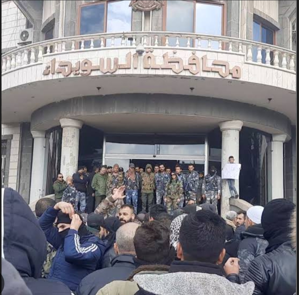 اقدم متظاهرون في مدينة السويداء بإزالة كلمة “محافظة” عن واجهة مبنى السرايا في مركز المدينة، في خطوة عدها نشطاء محليون “رمزية تعكس مطالبة المحتجين بالاستقلال الإداري وعدم تبعية المنطقة للسلطة الانتقالية”.