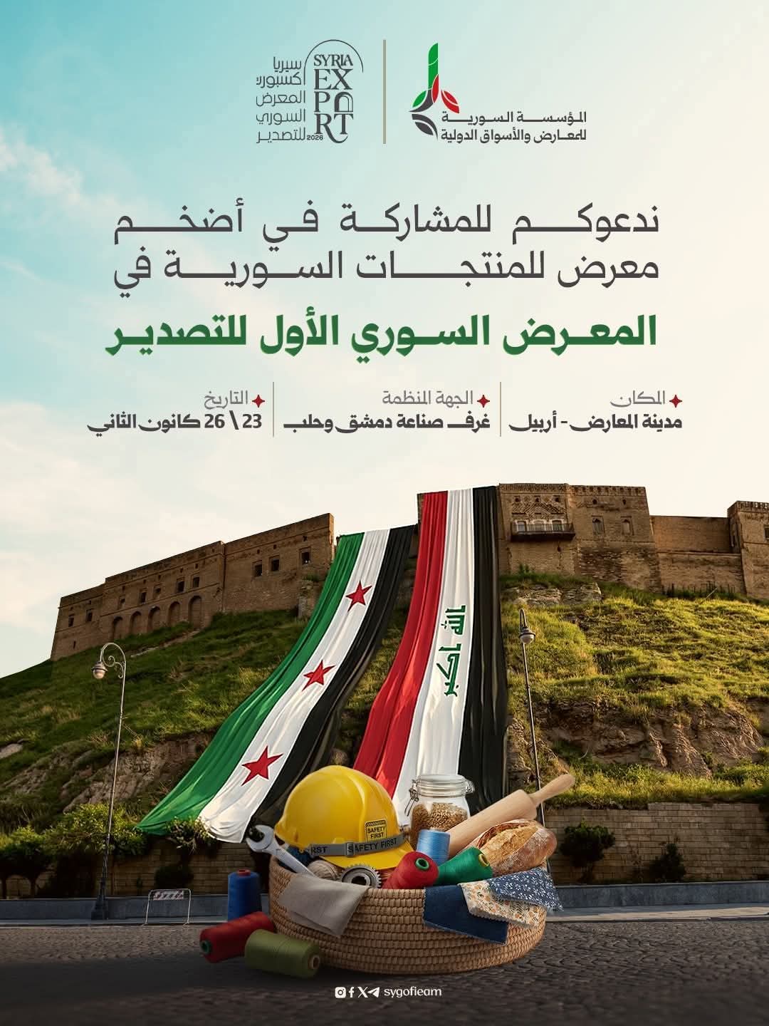 وذكر الإعلان أن المعرض سيقام برعاية غرفتي صناعة دمشق وحلب في مدينة أربيل، وذلك في الفترة من 23 إلى 26 كانون الثاني من عام 2026.