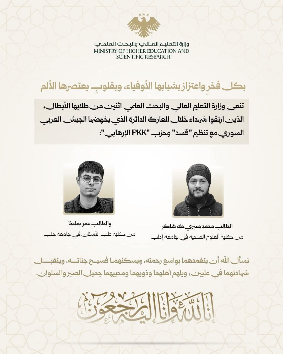 أعلنت وزارة التعليم العالي في السلطة الانتقالية عن مقتل اثنين من طلبتها قتلا خلال مشاركتهم في الهجمات التي نفذتها عناصر السلطة على الأحياء الكردية بمدينة حلب، إضافة إلى إصابة آخرين مشاركين في هذه الهجمات.