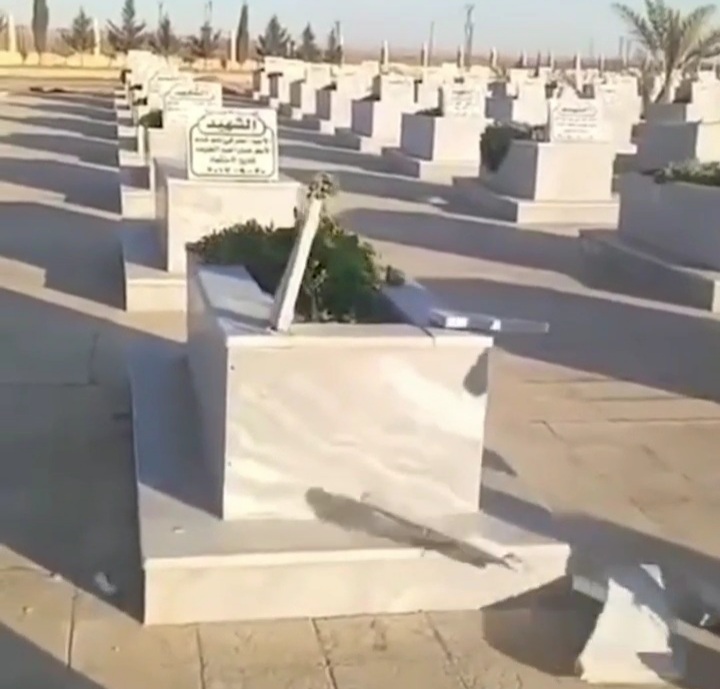 ووثقت مقاطع فيديو متداولة على نطاق واسع، أحد عناصر تلك الفصائل وهو يقوم بتكسير وتحطيم شواهد قبور الشهداء الواحد تلو الآخر، في مشهد أثار استنكاراً واسعاً على منصات التواصل الاجتماعي، حيث شبهه نشطاء ومحللون بأساليب كانت تتبعها جماعات متطرفة مثل “داعش” خلال سيطرتها على مناطق في سوريا والعراق سابقاً.