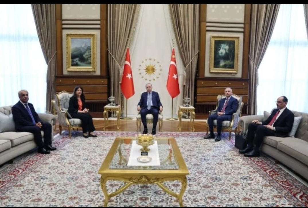 اجتمع وفد إمرالي لحزب المساواة وديمقراطية الشعوب مع الرئيس التركي رجب طيب أردوغان، داخل القصر الرئاسي في العاصمة أنقرة.