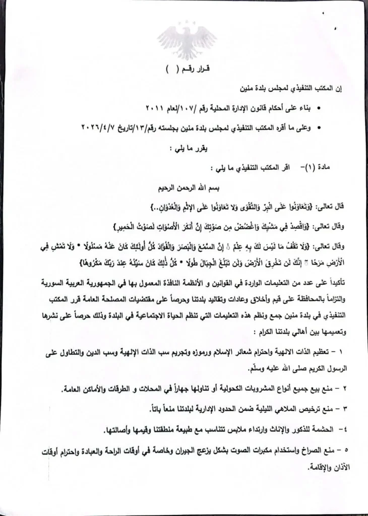 اصدرت بلدية منين بريف دمشق قراراً يمنع بيع المشروبات الكحولية وتراخيص الملاهي الليلية، ويفرض ضوابط على اللباس والسلوك في الأماكن العامة، إلى جانب حظر بعض الإجراءات الأخرى الشعبية، ما احدث حالة من الاستهجان لدى سكان المنطقة الذين اعتبروا أن البلدية تجاوزت بمثل هذا القرار صلاحياتها القانونية.