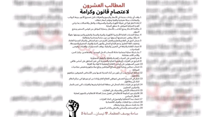 كما تضمّن البيان اتهامات للسلطات بالسعي لتمرير سياسات تضر بمصالح البلاد، محذراً من تصاعد الغضب الشعبي في حال استمرار الأوضاع الحالية، ومؤكداً أن “دمشق ليست للبيع”.