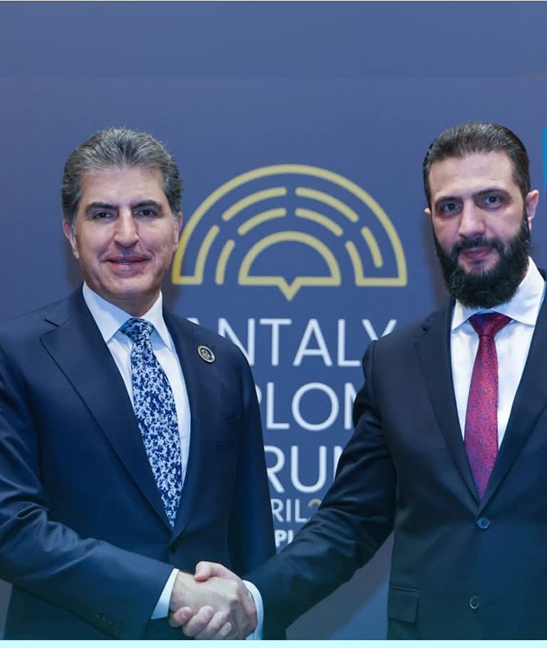 التقى رئيس إقليم كردستان، نيجيرفان بارزاني مع رئيس المرحلة الانتقالية أحمد الشرع، وذلك على هامش مشاركته في منتدى أنطاليا الدبلوماسي.